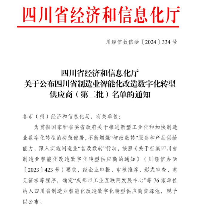2024年6月17日,四川省經(jīng)濟(jì)和信息化廳公布了《四川省制造業(yè)智能化改造數(shù)字化轉(zhuǎn)型供應(yīng)商(第二批)名單》,川投信產(chǎn)所屬川投數(shù)科(全稱:四川川投智勝數(shù)字科技有限公司,原全稱:四川川大智勝系統(tǒng)集成有限公司)(以下簡稱“川投數(shù)科(原簡稱:智勝集成)”)成功入圍“系統(tǒng)集成服務(wù)商”資源池。