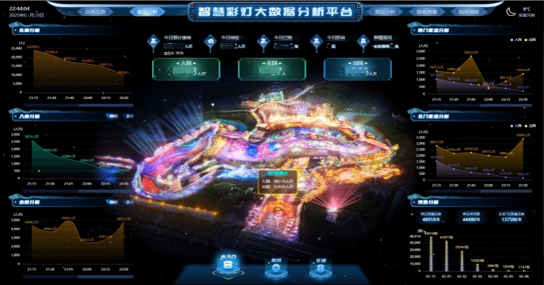 在自貢燈會的智慧化建設中,大數(shù)據(jù)分析系統(tǒng)扮演了至關重要的角色。通過數(shù)據(jù)中心所收集的數(shù)據(jù),景區(qū)管理人員可快速了解園區(qū)內(nèi)實時入園、出園、在園數(shù)據(jù)以及快速實現(xiàn)接待分析、售票數(shù)據(jù)分析、客源地分析、瞬時客流分析等功能。這些數(shù)據(jù)不僅為景區(qū)的日常運營提供了有力支持,還為未來的市場拓展和運營決策提供了有力數(shù)據(jù)支撐。